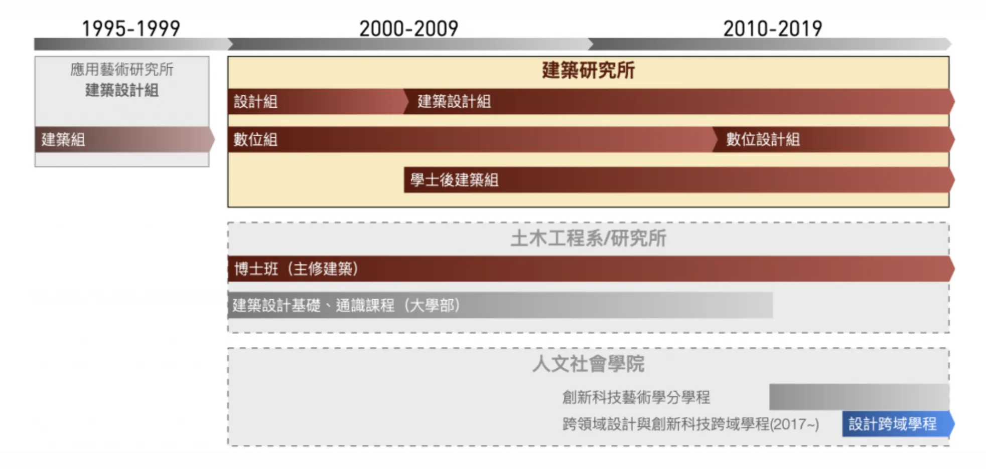 The institute originated as the Institute of Applied Arts – Architecture Group. Its main focus was on research in the Theory of Digital Architecture and the Process of Design Thinking. Professors Yu-Tung Liu and Chi-Yi Chang, along with 7–8 adjunct faculty members, led teaching and research, admitting 5–7 master’s students each year.
